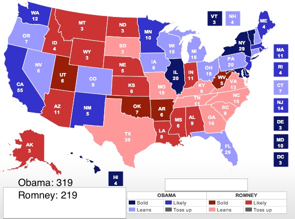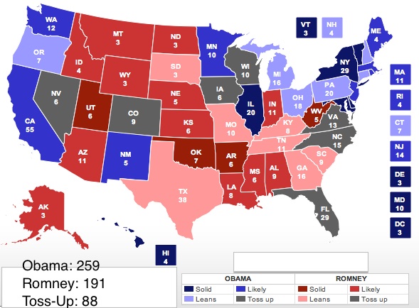 Big things to note: Michigan is still in the Obama camp and Ohio has now moved into the “leaning Obama” column. As in previous weeks, our rubric is as follows: