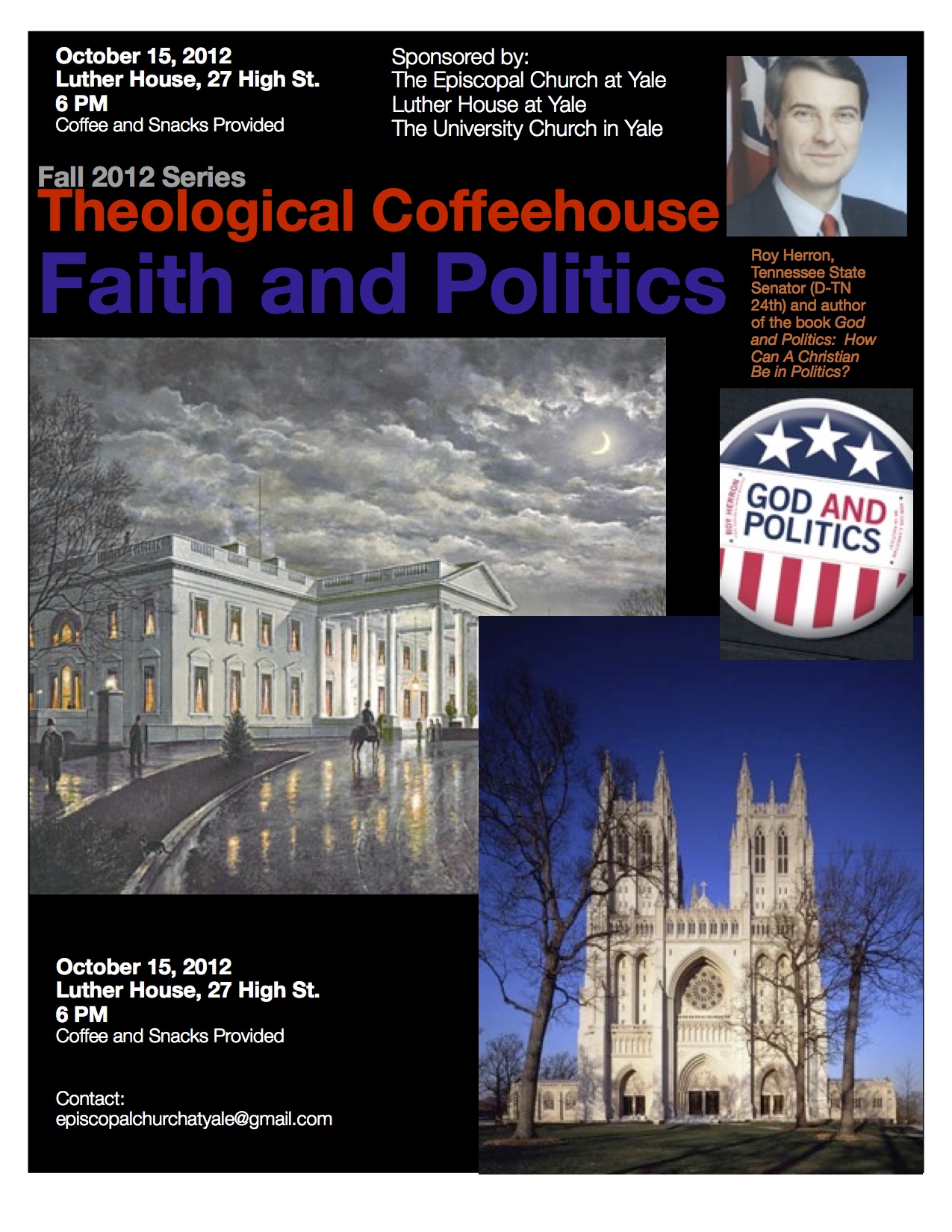 State Senator Roy Herron has an M.Div. and a J.D. from Vanderbilt University and has served as an attorney and a Methodist minister. He has also served in the Tennessee State Legislature (where, coincidentally, he currently represents my parents) for 26 years. Here is a link to his book God and Politics: How Can a Christian Be in Politics? If you are going to be in the New Haven area on October 15 and are interested in joining us, here is a link to the Facebook event with more information!